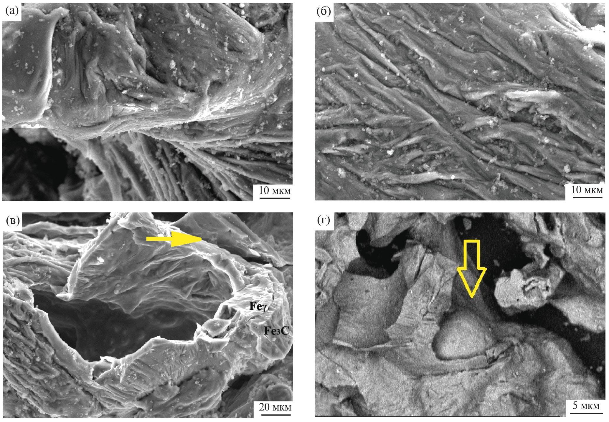 Рис. 5. Морфология поверхности частицы расплава СЧ 20, затвердевшей в условиях углового сдвигового деформирования (а); рельеф частицы с линейными деформационно-сдвиговыми полосами волокнообразного типа (б); растрескавшаяся частица с газовым пустотным ядром и с расслоившейся оболочкой из цементита Fe3C (в); растрескавшаяся частица с отслоившимся от внешней оболочки плотным сфероидным ядром (г).