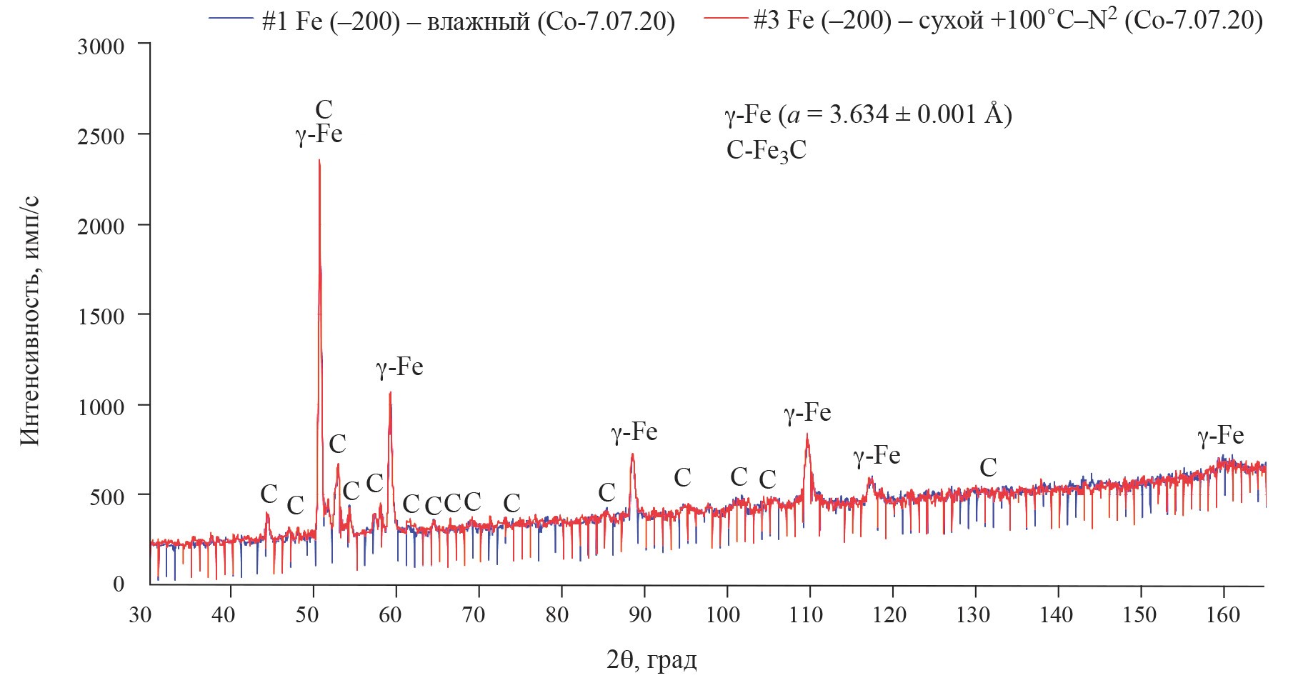 Микрорентгеноструктурный анализ (рис. 6) порошка, состоявшего из частиц такого типа, зафиксировал наличие двух отдельных фаз. Это γ-модификация железа и соединение железа с углеродом – цементит Fe3C. Путем EDS-спектроскопии поверхности разломов исследуемых частиц было уточнено, что обогащенная углеродом карбидная фаза “С” (Fe3C) в основном доминировала в периферийном, отслоившемся слое толщиной 5–7 мкм, а фаза “γ” (γ-Fe) в основном была представлена во внутренних, сравнительно толстых (20–25 мкм) слоях частиц. Т. е. частицы такого типа представляли собой смесь γ-железа и механически отслоившегося от него цементита (Fe3C), что предположительно можно объяснить эффектом пульсирующего звукокапилярного воздействия на жидкофазную систему Feγ-Fe3C и выталкивания на поверхность сравнительно легкого Fe3C. Сравнительным анализом морфологии исследуемых проб до и после их подготовки для EDS-спектроскопии было обнаружено, что обогащенная углеродом оболочка по сравнению с сердцевиной имела повышенную хрупкость, что можно объяснить ее малой толщиной и наличием множества усадочных микротрещин (на рис. 5в указана стрелкой). Наличие отмеченных микротрещин также привело к повышению площади поверхности и, следовательно, химической активности получаемых частиц.