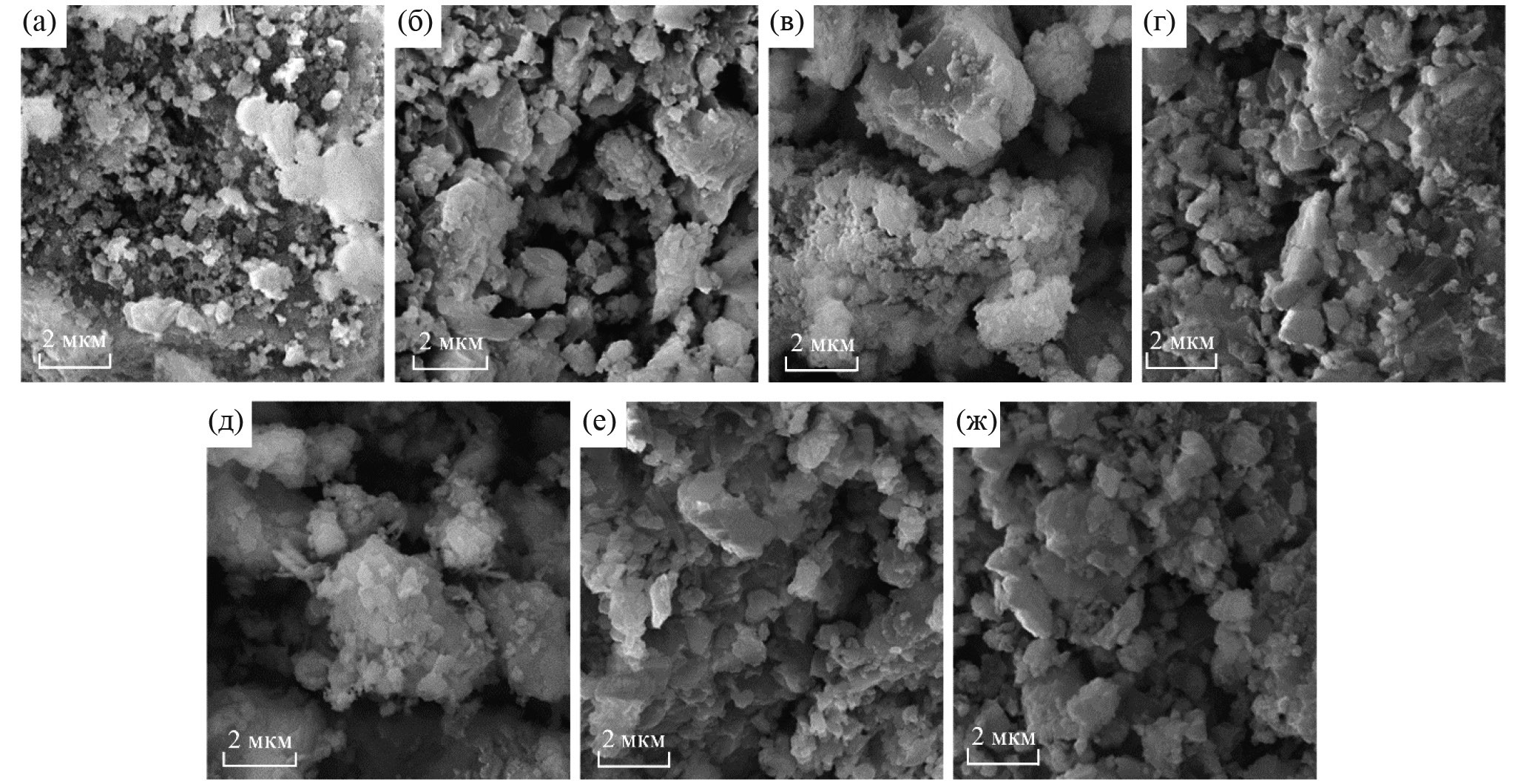 Рис. 1. Микрофотографии чистых ультрадисперсных порошков ZnO–ZnS (а) и порошков, синтезированных с добавками оксидов V2O5 (б), MnO (в), Fe2O3 (г), CoO (д), NiO (е) и CuO (ж).