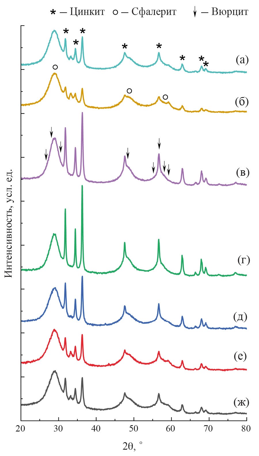 Рис. 3. Дифрактограммы порошков ZnO–ZnS (а), синтезированных с оксидами V2O5 (б), MnO (в), Fe2O3 (г), CoO (д), NiO (е) и CuO (ж).