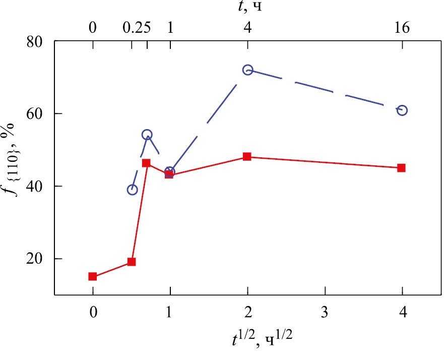 Рис. 10. Изменение доли площади, занятой зернами с ориентировкой {110}, в ходе отжига при 450°С железа, деформированного при 20°С (○) и 250°С (■).