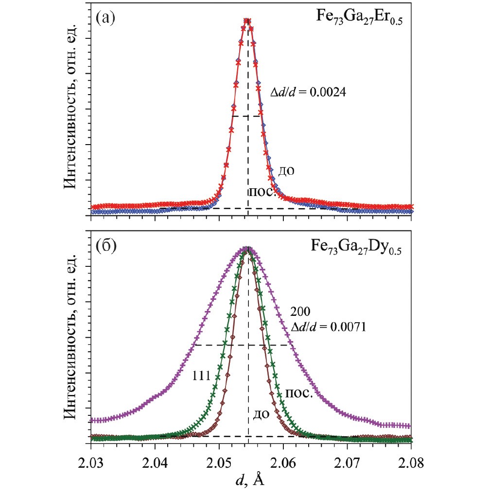 Достоверные причины этих эффектов пока не ясны. Можно предполагать разные фактические доли RЕ элементов, встроенных в структуру сплава и сконцентрированных по границам кристаллитов. Некоторое различие использованных RЕ элементов по ионным радиусам вряд ли может вызывать столь значимые следствия. Одной из вероятных причин может быть влияние магнитных характеристик этих элементов, по которым их можно разделить на три группы. Выделяются Dy и Yb с большим и малым магнитными моментами, соответственно, mDy = 10.5 mB, mYb = 4.4 mB. Третью группу составляют Er и Tb, магнитные моменты которых примерно одинаковы: mEr = 9.5 mB, mTb = 9.6 mB. Такое разделение коррелирует с особенностями представленных структурных перестроек. Проверка этого предположения могла бы состоять в анализе перестроек в сплавах, содержащих RЕ элементы с заметно другими магнитными моментами, например, с Sm (mSm = 1.5 mB) или с Ce (mCe = 2.4 mB). Возможно, что ab initio вычисления, например, такие как выполненные в работах [21, 22, 23], также помогут прояснить влияние RЕ элементов на структурные перестройки в сплавах Fe73Ga27RЕ0.5.