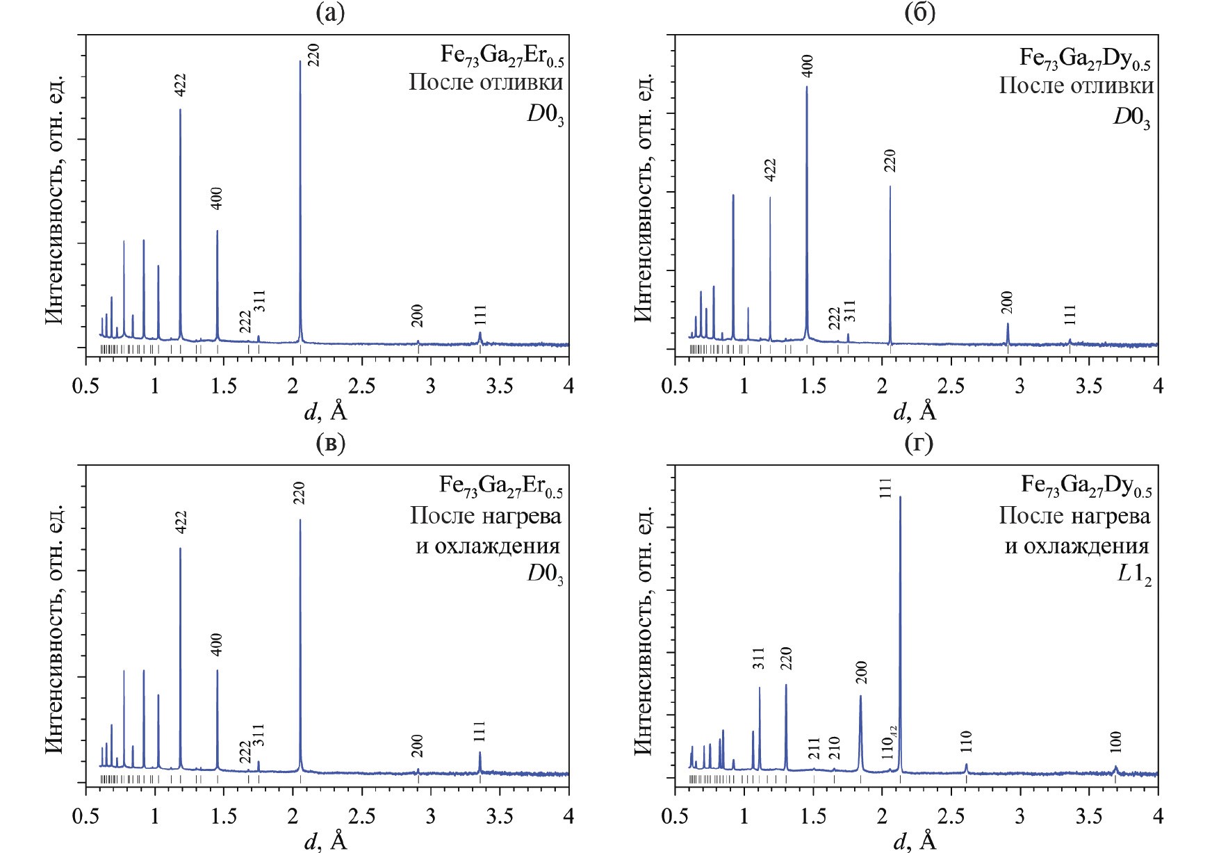Рис. 1. Нейтронные дифракционные спектры сплавов Fe73Ga27RE0.5, RE = Er, Dy, измеренные на HRFD (высокое разрешение) при комнатной температуре в исходном состоянии (после отливки) и после медленного нагрева (до 850°С) и последующего охлаждения до КТ. Указаны положения пиков фаз D03 (на а, б, в) и L12 (на г) и индексы Миллера некоторых пиков.