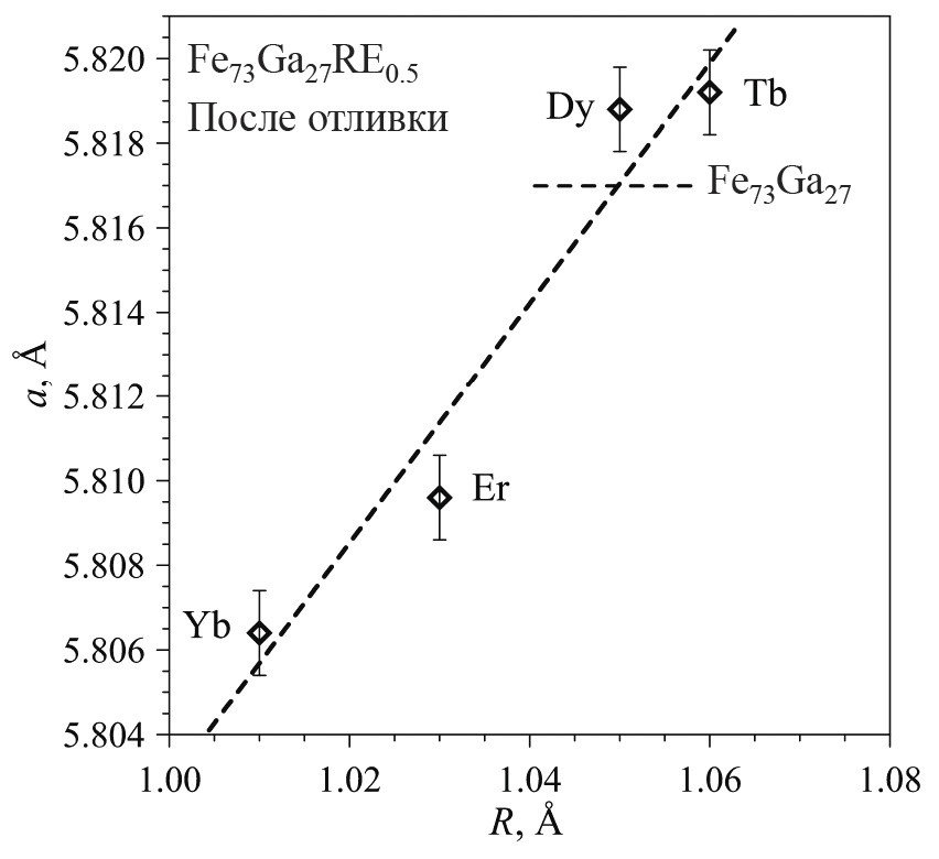 По вопросу степени растворимости RE элементов в Fe–Ga сплавах в литературе до сих пор нет точных данных. Наиболее исследованы сплавы с Tb, для растворимости которого в большинстве работ указывается 0.1–0.2 ат.%. Надежных данных по растворимости других RE элементов не существует. Некоторые оценки основываются на косвенных данных измерения магнитострикции и составляют от 0.1 до 0.6 ат.%. Показанная на рис. 4 корреляция параметра ячейки исходной фазы D03 с ионным радиусом RE элементов свидетельствует о том, что, возможно не вся, но все-таки значительная их доля встроена в кристаллическую решетку и оказывает влияние на магнитострикцию сплава через модификацию атомной и магнитной структуры. Обнаруженные изменения микроструктуры сплавов также подтверждают это предположение.