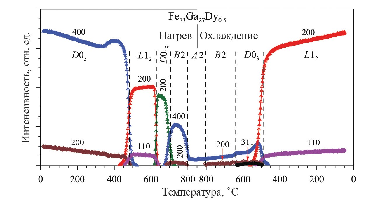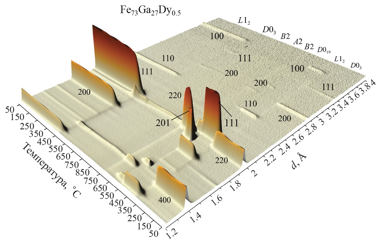 Фазовые переходы при нагреве и охлаждении. Анализ нейтронных дифракционных спектров, измеренных в ходе непрерывного нагрева и последующего охлаждения сплава со скоростью изменения температуры ±2°С/мин, позволяет детально проследить за происходящими в нем структурными фазовыми переходами. В сплаве Fe73Ga27Dy0.5 трансформации структуры во многом повторяют фазовые переходы, наблюдавшиеся для исходного сплава Fe73Ga27 [17, 18]. Их 3D-визуализация представлена на рис. 5, где видны сильные основные и слабые сверхструктурные дифракционные пики всех четырех структурных фаз, существующих в этом сплаве при разных температурах. На рис. 6 показано, как интенсивности характерных дифракционных пиков различных фаз меняются при нагреве и охлаждении. Обращает на себя внимание общее значительное уменьшение интенсивностей дифракционных пиков при высоких температурах, более сильное, чем в Fe73Ga27. В некоторой степени оно связано с уменьшением фактора Дебая–Валлера, но в основном с нарушением дальнего порядка, вплоть до частичной аморфизации структуры. Еще одним отличием от переходов в исходном сплаве стало формирование фазы B2 при нагреве в интервале (680–795)°С и при охлаждении в интервале (810–500)°С и формирование фазы D03 при охлаждении в интервале (635–500)°С. Интенсивности сверхструктурных пиков этих фаз относительно малы. Можно предполагать, следовательно, что либо эти фазы формируются в малых изолированных объемах образца, либо мала степень упорядочения их структуры. Но основной особенностью фазовых переходов в сплаве с Dy является полное отсутствие гексагональной фазы D019 при охлаждении, тогда как при охлаждении исходного сплава (без Dy) ее объемная доля и доля фазы L12 становились примерно одинаковыми при КТ.