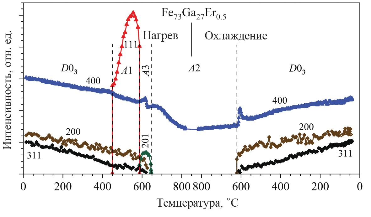 Рис. 8. Зависимости от температуры интенсивностей характерных дифракционных пиков сплава Fe73Gа27Er0.5 в ходе его нагрева и последующего охлаждениях.