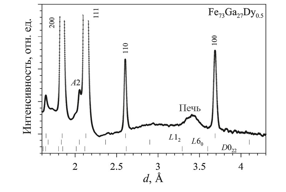 В Fe–Ga-сплавах с ~27 ат.% Ga возможно образование пяти типов структур [18], три из них основаны на ОЦК-ячейке: неупорядоченная А2 (кубическая, , a ≈ 2.91 Å, N = 2), частично или полностью упорядоченные D03 (кубическая, , a ≈ 2aА2 ≈ 5.82 Å, N = 16) и B2 (кубическая, , a ≈ 2.92 Å, N = 2), а также L12 (кубическая структура ГЦК-типа, , a ≈ 3.72 Å, N = 4) и D019 (гексагональная структура ГПУ-типа, P63/mmc, a ≈ 5.22 Å, c ≈ 4.23 Å, N = 8). Разупорядочение структуры L12 переводит ее в А1 (ГЦК-ячейка, , a ≈ 3.72 Å), а структуры D019 – в А3 с уменьшенным в 2 раза параметром а (a ≈ 2.64 Å). Далее для единообразия индексации дифракционных пиков структур А2, B2 и D03 будет использоваться элементарная ячейка фазы D03, в которой основные пики определяются условием h + k + l = 4n (напр., 220, 400 и т.д.). Сверхструктурные пики в этой фазе разрешены, если все индексы Миллера нечетные (напр., 111, 311 и т.д.) или если h + k + l = 2n (напр., 200, 222 и т.д.). В фазе А2 сверхструктурные пики запрещены, а в B2 разрешены основные пики, если h + k + l = 4n и сверхструктурные, если h + k + l = 2n.
