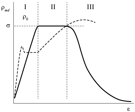 При этом границы полосы (фронты Людерса) равномерно движутся по образцу в разные стороны при постоянном напряжении . Когда вся рабочая часть образца оказывается заметенной этими фронтами, площадка текучести сменяется параболическим деформационным упрочнением. Как уже было сказано выше, фронт Людерса переводит среду из упругого в пластически деформируемое состояние, разграничивая упругую и пластическую области материала. При этом он обладает всеми признаками автоволны переключения в бистабильной среде [3, 16].