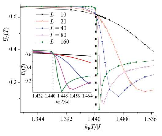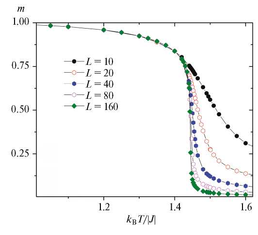 выявило ярко выраженную точку пересечения для решеток разных размеров L (см. рис. 6). Как видно из рисунка, эта точка соответствует критической температуре Tc=1.442(2).