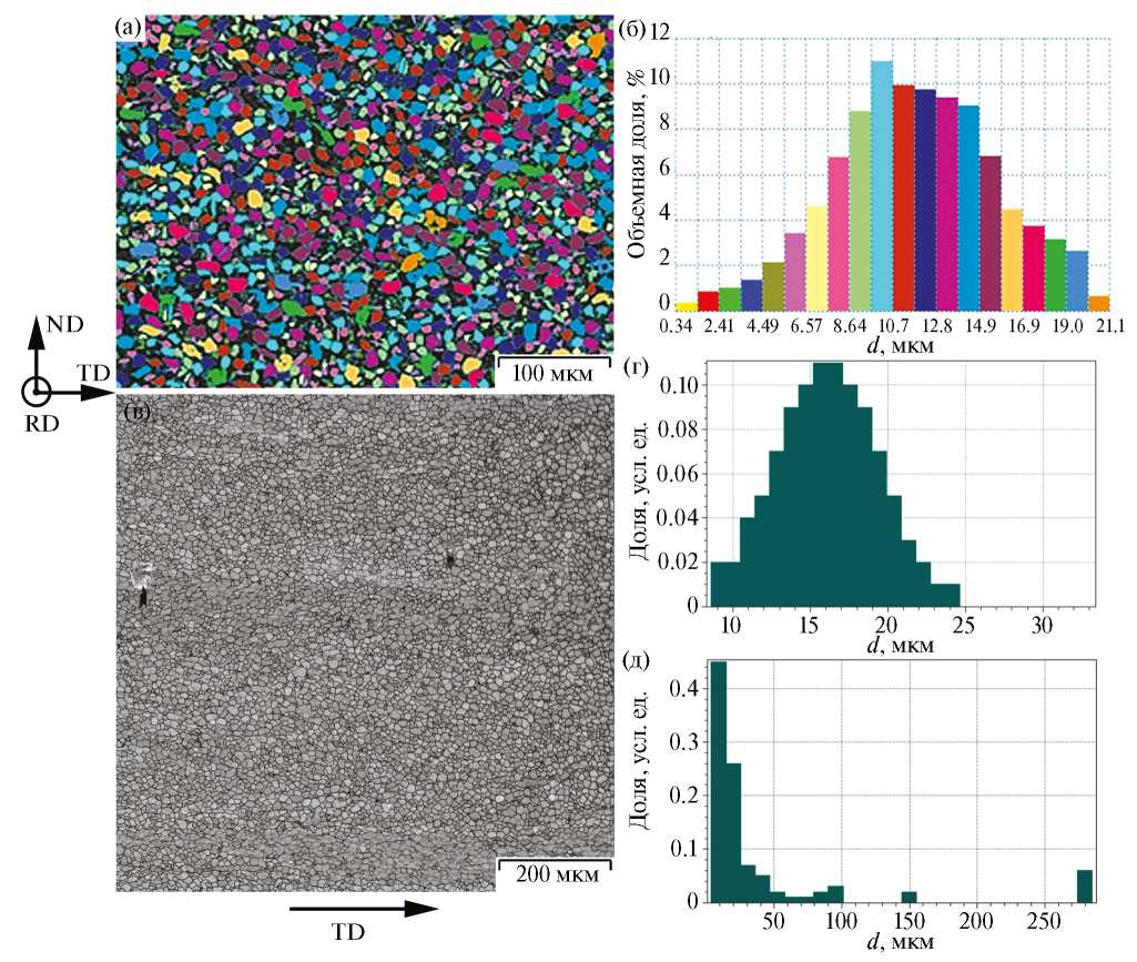 Микроструктурный анализ в данном поперечном сечении (RD) плиты сплава был выполнен как ранее для плоскости прокатки (ND) [34], используя различные методические возможности современной оптической металлографии (ОМ), растровой (РЭМ) и просвечивающей (ПЭМ) электронной микроскопии. На рис. 2 представлены ОМ- (рис. 2а) и РЭМ- (рис. 2в) изображения (РЭМ в режиме вторичных электронов SE). ОМ-изображение равноосной МЗ α-фазы приведено в цветовой кодировке, соответствующей цветам столбцов гистограммы распределения по размерам (рис. 2а, б). По РЭМ SE-данным кристаллиты α-фазы также имеют практически равноосную глобулярную форму со средним размером, близким 12 мкм. МЗ-структура характеризуется узким распределением α-зерен по размерам, (ширина распределения не превышает величины двух средних размеров зерен при анализе площади 1 мм2) (рис. 2г). При съемке РЭМ SE-изображений с большей на порядок площади образцов были также выявлены редко расположенные более крупные α-зерна (рис. 2д). Наконец, при анализе РЭМ-изображений на рис. 2в визуально обнаруживается тенденция к формированию планарной слоистой морфологии α-зерен в направлении, параллельном TD, которое является нормалью к RD и ND.