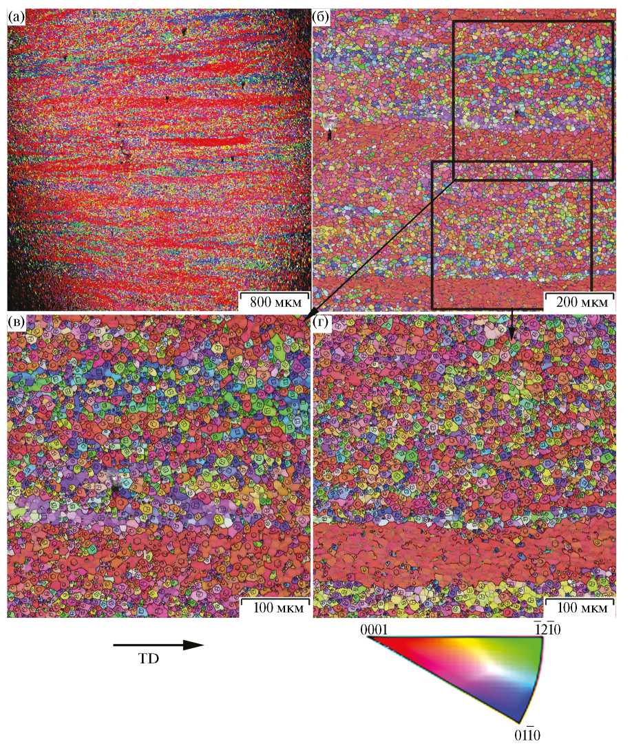 На рис. 5 представлены ДОРЭ-карты в другой модификации: в виде карт распределения α-зерен по кристаллографическим ориентациям, в том числе в виде увеличенных фрагментов ДОРЭ-карты (рис. 5б–г). Совпадение цвета различных α-зерен на ДОРЭ-картах (рис. 5), определяемого стандартным треугольником обратной полюсной фигуры (ОПФ), и совпадение проекций элементарной ячейки α-ГПУ фазы характеризуют близость кристаллографической ориентации данных зерен. Видно, что доминируют более широкие слои близко ориентированных вдоль TD α-зерен с красно-розовой окраской (с полюсами ОПФ, близкими 0001 и 011). Но есть и короткие цепочки зерен одного цвета, которые имеют синюю (полюс 010) или зеленую (полюс 20) цветовые кодировки на ОПФ. Все они отвечают, соответственно, базисной, пирамидальной и призматической плоскостям, которые параллельны плоскости поперечного сечения (RD). Установлено, что при размерной близости α-зерен в плоскости прокатки (ND) и поперечном сечении (RD) их распределение по кристаллографическим ориентациям, определяющее текстуру, принципиально отличается [34].