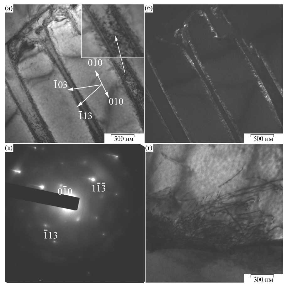 Наконец, светло- и темнопольное ПЭМ-изображения иллюстрируют пакетную морфологию расположенных параллельно тонких двойниковых по плоскости {101} α-пластин (рис. 10а, б), а также дислокационное скопление у границы α-зерен (рис. 10г). Отвечающая двойниковой структуре микроэлектронограмма в плоскости обратной решетки (301) приведена на рис. 10в. В соответствии с ней на рисунке 10а даны результаты следового ориентационного анализа. Дополнительные рефлексы от двойников на микроэлектронограмме не обнаружены, но есть закономерно размытые вдоль одного направления рефлексы a-матрицы.