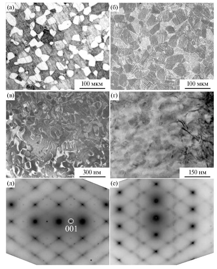 На рис. 1а, б представлены типичные ОМ- и РЭМ-картины зеренной микроструктуры закаленных после ковки сплавов Сu–38Zn и Сu–39.5Zn с размерами зерен менее 50 мкм. β-аустенит данных сплавов испытал фазовый переход “беспорядок–порядок” β→β2(B2) ниже температур 450–470°C и выше температуры Ms [2, 3]. Многозародышевый механизм перехода образует особую субструктуру так называемых антифазных доменов (АФД) [25]. Они визуализируются появлением их границ (АФГ) на светло- и темнопольном (например, в сверхструктурном отражении 001) ПЭМ-изображениях (рис. 1в, г). Ранее нами было установлено [20], что в сплавах системы Cu–Al–Ni аустенит имеет упорядоченную по типу D03- структуру, и при ТМП дальний атомный порядок наследуется структурой мартенсита. Это определяет их ориентационную кристаллоструктурную обратимость и фазовую термоупругость. В исследуемых сплавах Cu–Zn β2-аустенит является упорядоченным по типу B2. На рисунке 1в, г наблюдаются АФГ лабиринтной морфологии, ориентированные преимущественно по кристаллографическим плоскостям типа {100} и {110}.