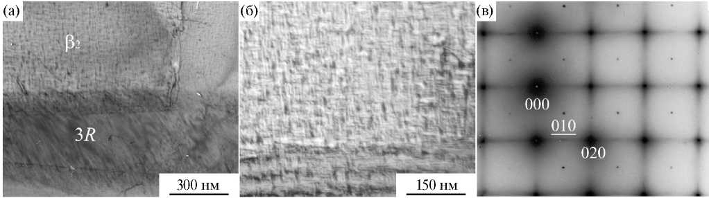 Рис. 2. Светлопольные ПЭМ-изображения твидового контраста (а, б) и соответствующая микроэлектронограмма ((в) — о.з. [100]B2) двухфазного (β2+3R)-сплава Cu–38Zn при КТ.