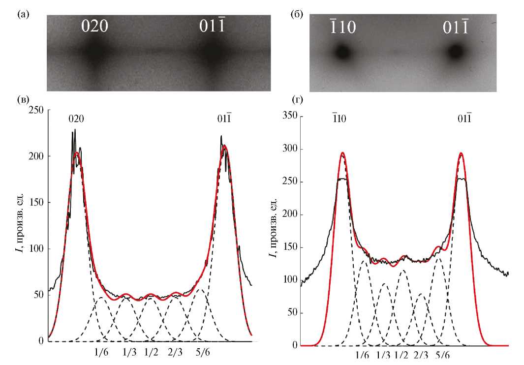 Количественный цифровой анализ интенсивности диффузного рассеяния для микроэлектронограмм в двух сечениях (100)* и (111)*, фрагменты которых представлены на рис. 7а, б, описывает сателлиты типа “1/6”, “1/3” и “1/2”, ответственные за появление ПСС-I и ПСС-II. Отметим, что сплошные жирные линии на рис. 7в, г представляют собой профили интенсивности диффузного рассеяния электронов, рассчитанные с использованием функции Гаусса.
