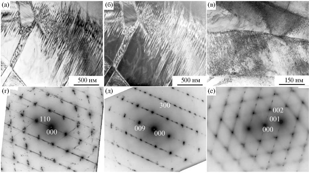 Рис. 9. Светло- (а, в) и темнопольное (б) ПЭМ-изображения микроструктуры орторомбического β2″(9R) (а, б, г, д) и гексагонального γ2′(2H) мартенсита (в, е) и соответствующие микроэлектронограммы (с о.з. [010]9R (г, д), близкой [11]B2, и о.з. [010]2H (е)) сплава Cu–39.5Zn. Наблюдения при температуре –150°С.