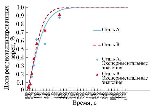 Отклонение экспериментальных значений от расчетных при достижении степеней рекристаллизации >70% может объясняться тем, что при данных значениях доли рекристаллизованного материала уравнение Колмогорова–Аврами–Мела–Джонсона хуже описывает кинетику процесса, чем при более низких степенях рекристаллизации [17]. Фактически, основываясь в первую очередь на экспериментальных значениях, можно заключить, что при степенях рекристаллизации более 70% в стали А наблюдается более сильное торможение процесса рекристаллизации, чем в стали В.