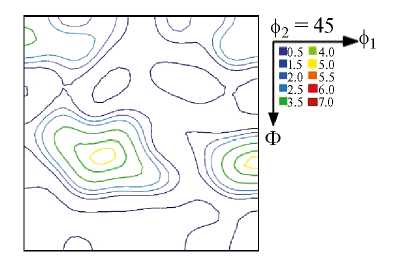 На рис. 7 приведено сечение усредненной ФРО для карт EBSD, снятых на последнем этапе рекристаллизации и отражающих конечную текстуру первичной рекристаллизации. Как видно из данной ФРО, в текстуре преобладают такие компоненты, как {111}<112> и {554}<225>. Именно эти компоненты являются основными для рассмотренных выше диапазонов средних и крупных зерен. Таким образом, показано, как путем преимущественного роста зерен с данными ориентировками формируется итоговая текстура первичной рекристаллизации, в то время как исходно превалирующие на этапе начала первичной рекристаллизации зерна с ориентировками α- и γ-волокна поглощаются (мелкие зерна) и не вносят свой вклад в итоговую текстуру первичной рекристаллизации.