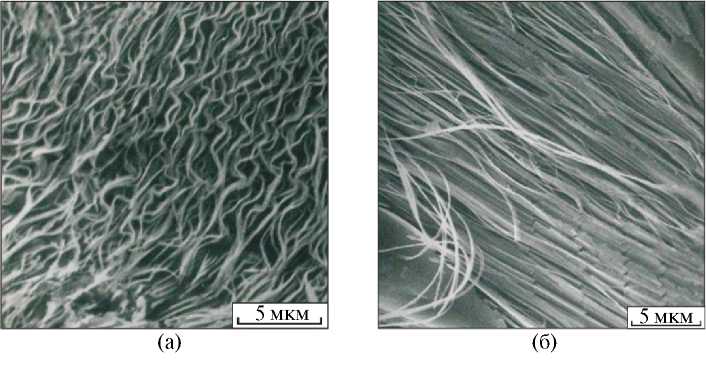 Исследуя методом растровой электронной микроскопии (РЭМ) глубоко протравленную поверхность пластически деформированной высокоуглеродистой стали St60 (0.60%C), Батаевым были выявлены искривленные пластины цементита (рис. 2а). Отсутствие в поверхностном слое стального образца ферритной матрицы объясняет хаотичную форму пластин, находящихся в напряженном состоянии. В то же время необычными объектами исследования являются фрагменты цементита в форме волокон (рис. 2б). Объяснений такого явления авторы работы в литературе не встречали.