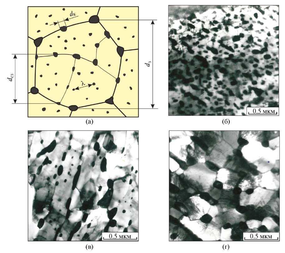 Рис. 9. Строение глобулярного перлита: а — схема строения; dз — диаметр зерна феррита; dсз — диаметр субзерна феррита; λ — межкарбидное расстояние; dк — диаметр карбидной частицы; б–г — структура, зафиксированная методом просвечивающей электронной микроскопии (снимки А.А. Батаева).