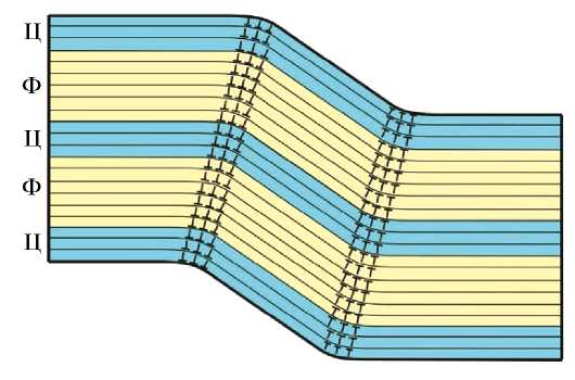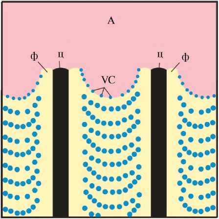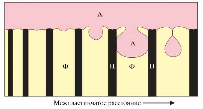 Никулиной и Смирновым при проведении электронно-микроскопических исследований структуры перлита, возникающего в зонах сопряжения высоколегированного и нелегированного аустенита, зафиксирован необычный характер структурных преобразований [56]. Особенность ферритных пластин перлита заключается в том, что клинообразными выступами аустенита они разделены на две части. Схематически такая структура представлена на рис. 12. В сечении В–В слоистая структура является трехфазной. Расположенные в ней слои цементита, феррита и аустенита чередуются в последовательности “…Ц–Ф–А–Ф–Ц–Ф–А–Ф…”. Предполагается, что присутствие клинообразных включений аустенита обусловлено наличием сжимающих напряжений, сопутствующих γ→α-превращению.
