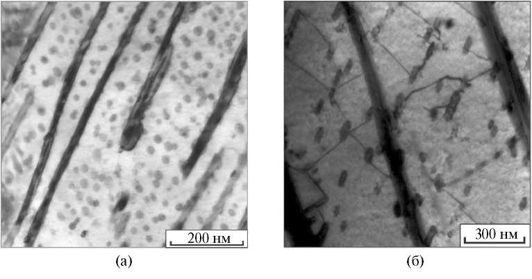 Рис. 4. Дефектное строение пластинчатого перлита: а — прерванная цементитная пластина; б — криволинейные цементитные пластины (ПЭМ, снимки А.А. Батаева).