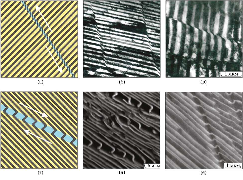 Один из наиболее важных выводов, зафиксированных при проведении электронно-микроскопических исследований перлита, связан с формированием в цементитных пластинах множества планарных дефектов, расположенных друг относительно друга на расстоянии ~ 15–30 нм. Показано, что образуются они непосредственно в процессе изотермического распада аустенита при 500–700°С. Схематически множество планарных дефектов, пересекающих цементитные пластины, отражено на рис. 1а (указаны стрелками). Экспериментально установлено, что анализируемые дефекты располагаются в плоскостях двух кристаллографических типов (101)ц и {103}ц.