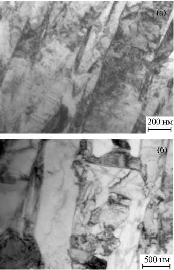 Рис. 4. Светлопольные электронно-микроскопические изображения микроструктуры в зонах ОМ (а) и СШ (б) в СЛС-образце.