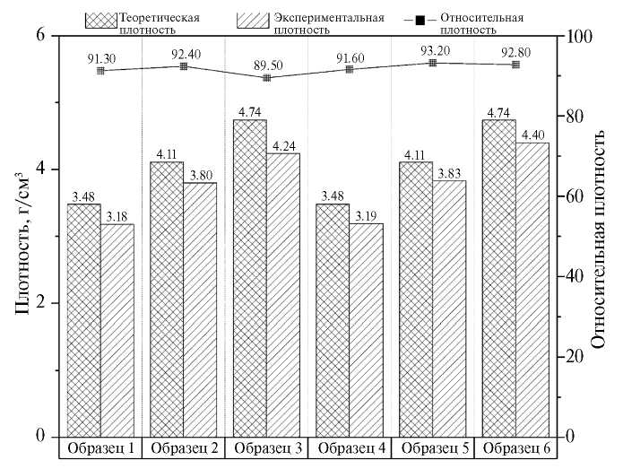 где Ws и Wa представляют собой массу образцов, взвешенных в воздухе и в воде, соответственно. Так как образцы взвешивали в чистой воде, ρl — плотность чистой воды. Относительное значение плотности рассчитывали как отношение экспериментального значения плотности к теоретическому значению плотности, согласно уравнению (3):