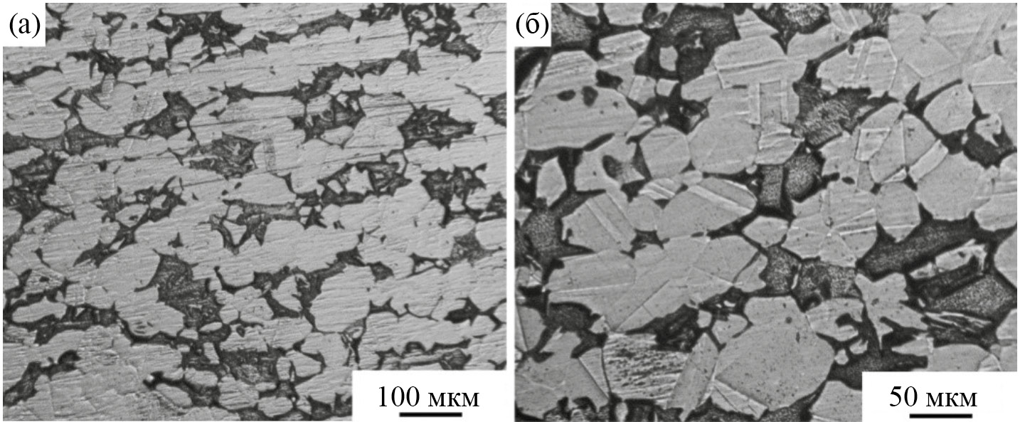 Рис. 4. ОМ-изображения микроструктуры сплава Cu–41%Zn после горячей прокатки с закалкой (а) и отжига при 200°С, 2 ч (б).