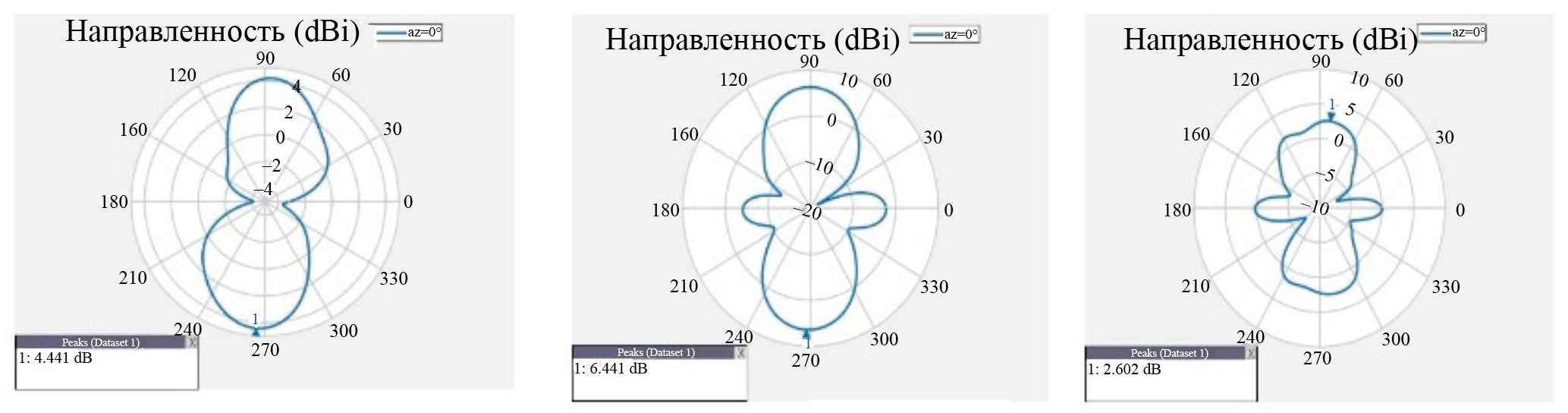 Для оценки возможности применения дендритов в качестве прототипа наноантенн было проведено моделирование диаграммы направленности для трех различных частот (рис. 16). Результаты моделирования были получены нами средствами Matlab, Mathworks в модуле Antenna Toolbox. Моделирование реализовывали на основе решений уравнений Максвелла [62–64]. Такое приближение было выбрано в связи с тем, что усиление антенны в общем случае определяется эффективностью излучения с учетом диссипативных потерь и коэффициентом направленности излучения в дальней зоне.