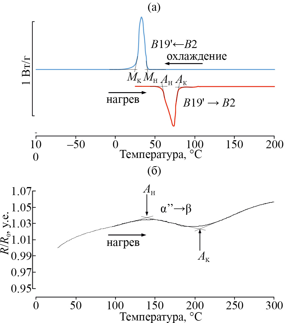 Как видно на рис. 1а, на кривых ДСК при нагреве и охлаждении наблюдаются пики, соответствующие обратному B19ʹ→B2 и прямому B2→B19ʹ-превращениям. Температуры начала и окончания обратного мартенситного превращения определены как Аs=55°С и Аf=85°С. Поскольку мартенситные превращения в сплавах системы Ti–Zr–Nb имеют большую ширину интервала превращений, проявляют слабый тепловой эффект и развиваются при охлаждении вяло, ДСК традиционно не используется для сплавов этой системы. Поэтому для определения интервала обратного αʹʹ→β-мартенситного превращения применили метод определения изменения удельного электрического сопротивления (R/R0, где R0 – электросопротивление при Ткомн) при нагреве (рис. 1б). Измерение электросопротивления проводили на специально спроектированной установке, оснащенной термокамерой с контроллером ОВЕН ТРМ-151 и мультивольтметром ПРИСТ B7-78/1, подключенным к ПК. Скорость нагрева составляла 5°С/мин. На кривой температурной зависимости удельного электросопротивления СПФ Ti–18Zr–12Nb видны два перегиба, отвечающие температурам начала и окончания обратного αʹʹ→β-мартенситного превращения: Аs=145°С и Аf=210°С.