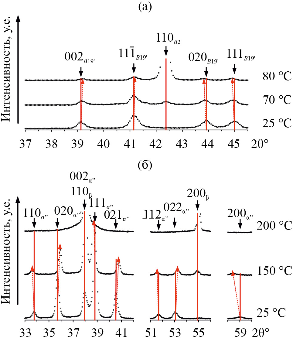 Как видно из рис. 2а, при Ткомн фазовый состав сплава Ti–50.26Ni представлен полностью B19ʹ-мартенситом без следов каких-либо других фаз. При повышении температуры до 70°С его рентгеновские линии незначительно ослабевают и появляется линия {110}B2-аустенита, что свидетельствует о начале обратного превращения B19ʹ→B2. Дальнейшее повышение температуры до 80°С приводит к существенному ослаблению линий B19ʹ-мартенсита и значительному росту интенсивности линии {110}B2-аустенита. На основании этих данных в качестве температуры начала потери стабильности B19ʹ-мартенсита для дальнейшего исследования выбрали температуру 70°С. Из рис. 2б видно, что в случае сплава Ti–18Zr–12Nb при Ткомн отчетливо видны линии αʹʹ-мартенсита. Пик, лежащий в области 38°, может быть отнесен как к (002)αʹʹ, так и к {110}β. Однако отсутствие явного пика {200}β свидетельствует о весьма малом количестве β-фазы и позволяет отнести этот пик к (002)αʹʹ. Повышение температуры до 150°С приводит к ослаблению интенсивности линий αʹʹ-мартенсита, а интенсивность пика в области 38° увеличивается и появляется отчетливый пик {200}β. Следовательно, можно утверждать, что на месте линии (002)αʹʹ появляется и заметно усиливается линия {110}β. Дальнейшее повышение температуры до 200°С приводит к практически полному исчезновению линий αʹʹ-мартенсита и резкому усилению линий β-фазы. Таким образом, в качестве температуры начала потери стабильности αʹʹ-мартенсита была выбрана температура 150°С.