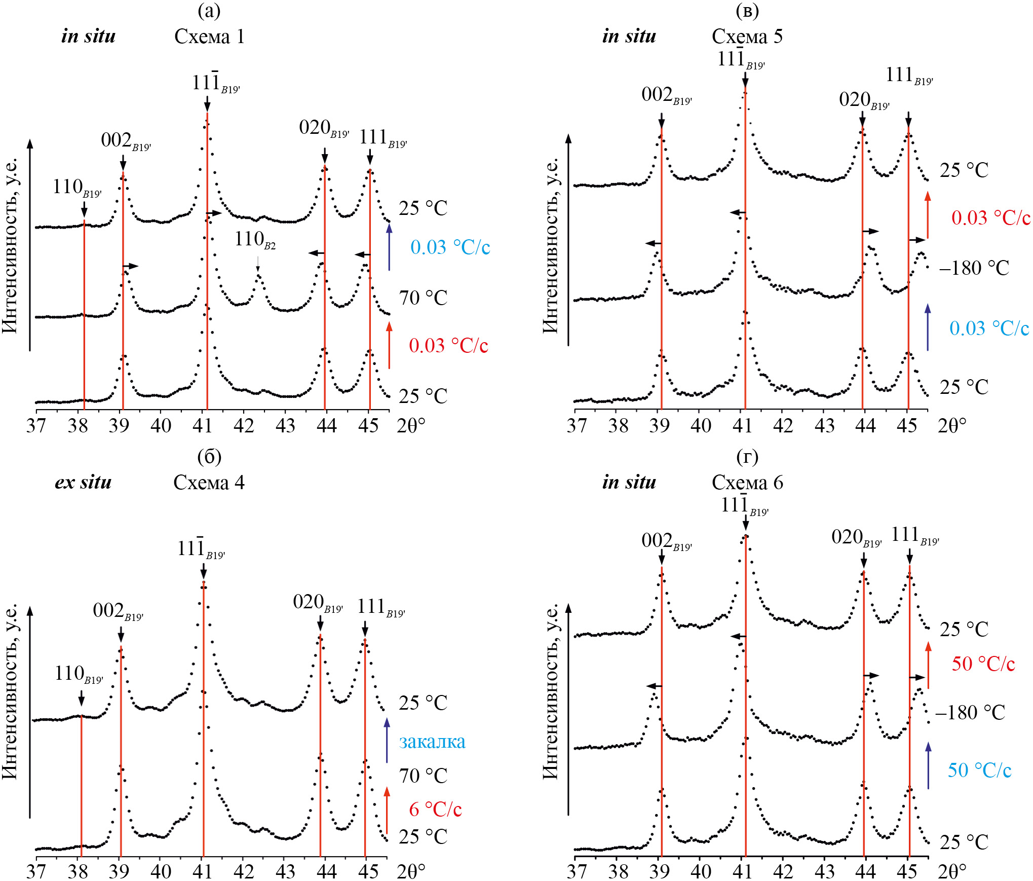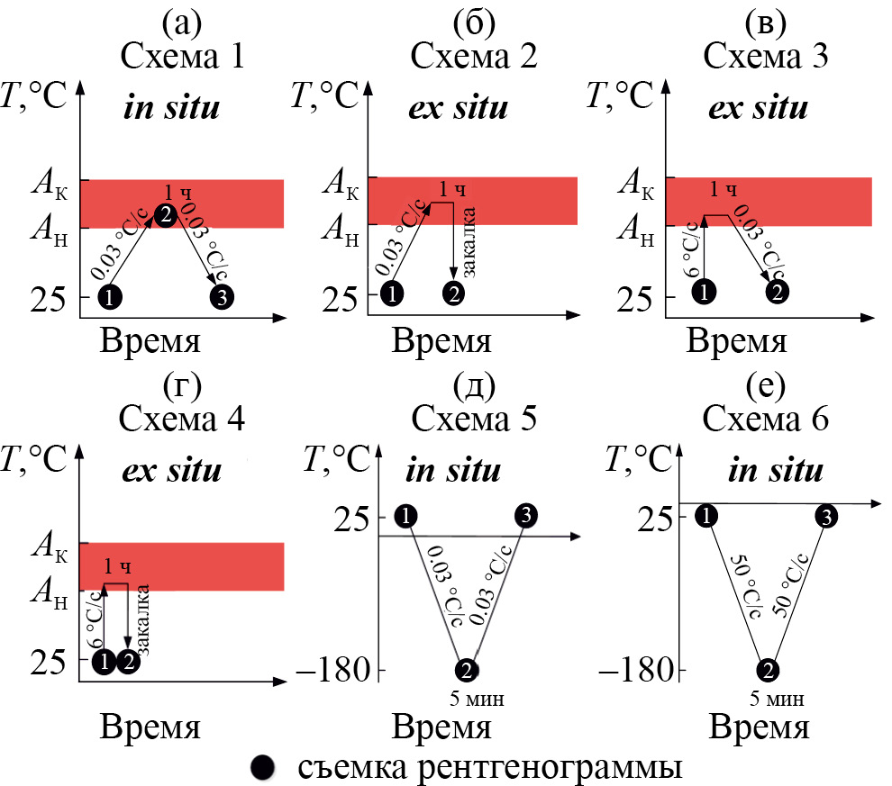 Поскольку при длительных выдержках в высокотемпературной части интервала существования мартенсита не были зафиксированы какие-либо изменения решетки мартенсита, было решено ужесточить условия эксперимента, максимально ограничив время охлаждения и/или нагрева и пребывания при температуре сканирования рентгенограммы. Для этого провели эксперименты in situ и ex situ при варьировании скоростей нагрева и охлаждения. При этом температурный интервал исследований расширили в сторону низких температур до криогенных (≤–180°С). В последнем случае использовали и прямое охлаждение жидким азотом для максимальной скорости фиксации высокотемпературного состояния решетки мартенсита. Для исследования влияния скоростей нагрева и охлаждения на параметры решетки мартенсита были выбраны следующие схемы эксперимента (см. рис. 7).