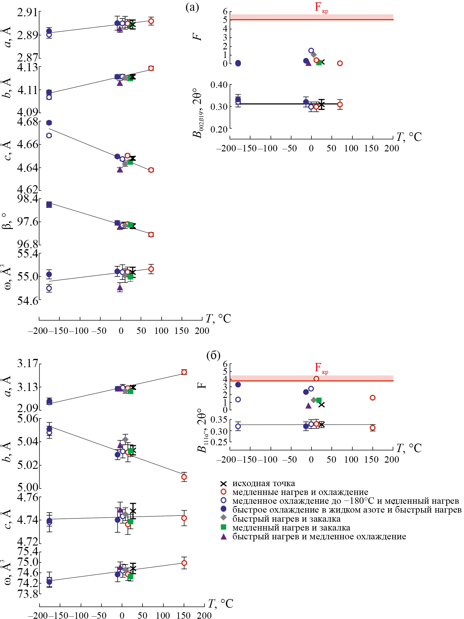 Рис. 10. (а) параметры решетки B19′-мартенсита a, b, c, β, объем элементарной ячейки мартенсита ω=a·b·c·sinβ, критерий Фишера (F) и ширина рентгеновской линии B002B19′ СПФ Ti–50.26Ni; (б) параметры решетки α"-мартенсита a, b, c, объем элементарной ячейки мартенсита ω=a·b·c, критерий Фишера (F) и ширина рентгеновской линии B111α" СПФ Ti–18Zr–12Nb, полученные по разным схемам нагрева–охлаждения.