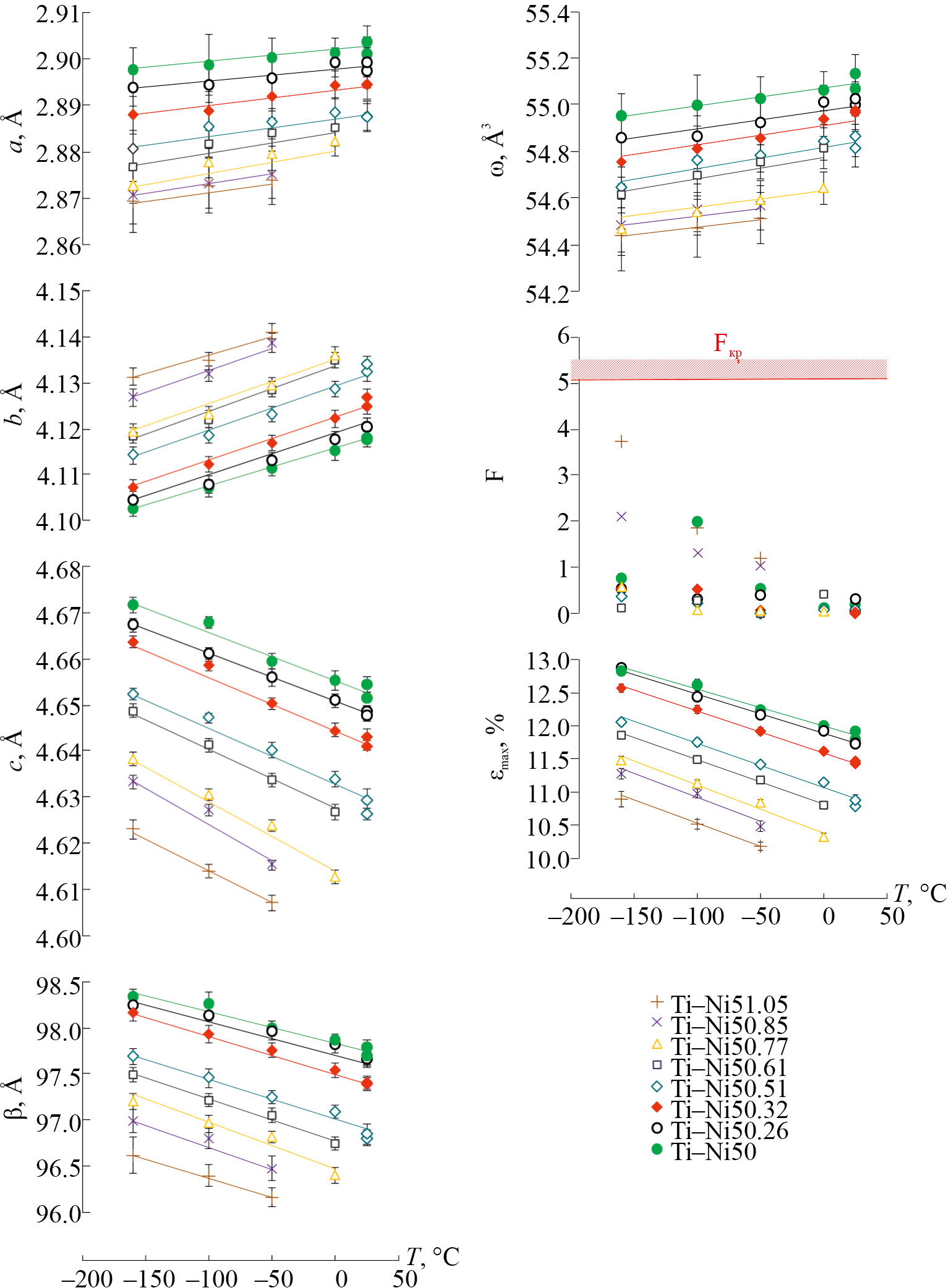 Рис. 11. Температурные зависимости параметров решетки B19′-мартенсита, критерия Фишера F и максимальной деформации решетки εmax при B2↔B19′-превращении в закаленных от 700°С сплавах Ti–(50.0–51.05)% Ni. Расчет по рентгенограммам из работы [3].
