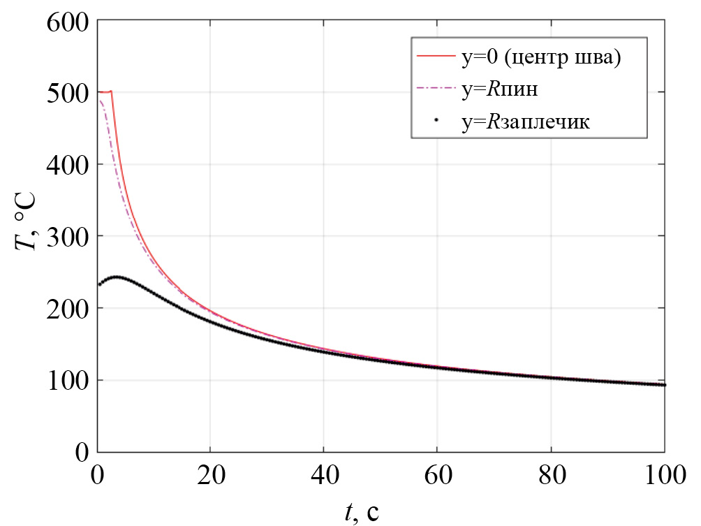 Рис. 2. Термические циклы трех точек поверхности, расположенных в центре шва, на расстоянии, равном радиусу пина и радиусу заплечика.