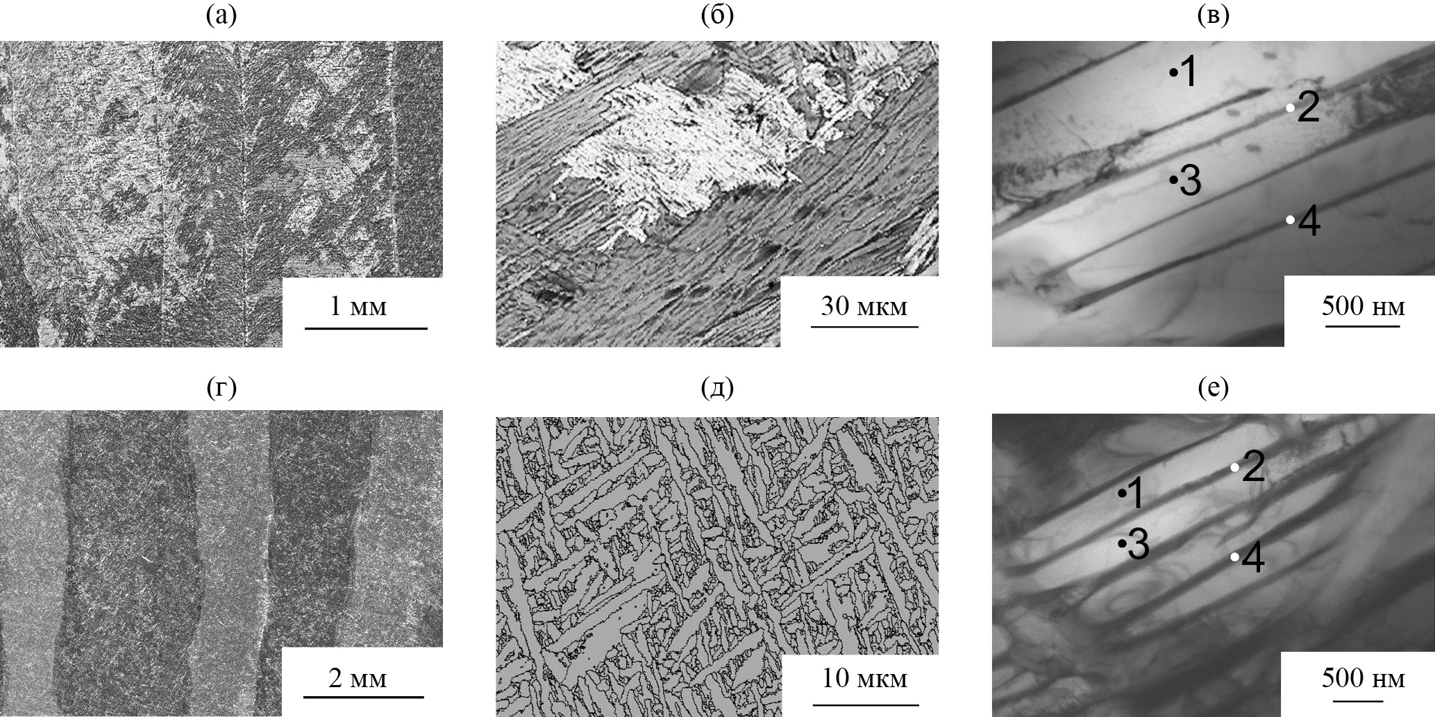 Микроструктура 3D-напечатанных образцов Ti–6Al–4V и Ti–5Al–3Mo–V состоит из столбчатых первичных β-зерен, ориентированных вдоль направления роста изделия (рис. 1а, г) с близкими поперечными размерами (1–2 мм), рост которых обусловлен направленным теплоотводом в процессе кристаллизации ванны расплава. При этом зеренная структура 3D-напечатанных образцов Ti–6Al–4V и Ti–5Al–3Mo–V в значительной степени различается (рис. 1б, д). Так, в титановом сплаве Ti–6Al–4V столбчатые первичные зерна β-фазы содержат пластины как α-, так и αʹ-фазы, которые сгруппированы в пакеты и имеют средний поперечный размер 0.6 мкм (рис. 1б, в). В свою очередь, в титановом сплаве Ti–5Al–3Mo–V формируются более тонкие мартенситные иглы αʹ-фазы со сложной корзинчатой структурой (рис. 1д, е). Средний поперечный размер игл составляет 0.35 мкм. Согласно ПЭМ-исследованиям, между пластинами/иглами α/αʹ фазы наблюдаются прослойки остаточной β-фазы, средний поперечный размер которых в 3D-напечатанных образцах сплавов Ti–6Al–4V и Ti–5Al–3Mo–V составляет 100 и 120 нм соответственно (рис. 1в, е).