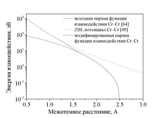 Оригинальные потенциалы [64] не подходят для моделирования радиационных эффектов в облучаемых материалах. Если парная часть Fe–Fe потенциала [64] взята из [68] и адекватно описывает взаимодействие атомов на коротких расстояниях, то про парные части потенциалов Cr–Cr и Fe–Cr этого сказать нельзя. Для корректного моделирования процесса радиационного дефектообразования в каскадах смещений в бинарных сплавах Fe–Cr потенциалы, описывающие взаимодействие атомов Сr между собой и с атомами Fe, необходимо модифицировать на коротких расстояниях.