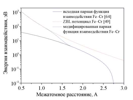 Модифицированную парную функцию взаимодействия Cr–Cr использовали для подгонки кросс-потенциала Fe–Cr на коротких расстояниях. Процедура подгонки кросс-потенциала Fe–Cr не отличается от подгонки парного потенциала взаимодействия Cr–Cr за одним исключением. Пороговые энергии смещения в бинарных системах Fe–Cr никогда экспериментально не измеряли, а значит, на первый взгляд, отсутствуют необходимые данные, которые можно было бы использовать в качестве подгоночных параметров. Однако в исследовании [73] показано, что статистически значимая разница между пороговыми энергиями смещения в сплаве Fe–10 ат.%Cr и чистом a-Fe отсутствует, и, следовательно, экспериментально измеренные пороговые энергии смещения в чистом a-Fe могут быть использованы для подгонки кросс-потенциала Fe–Cr. Пороговые энергии смещения в чистом a-Fe и пороговые энергии смещения модифицированного кросс-потенциала Fe–Cr вдоль различных кристаллографических направлений приведены в табл. 1, которая была также дополнена результатами других исследований по этой теме для проведения сравнительного анализа. Исходный парный кросс-потенциал Fe–Cr, модифицированный кросс-потенциал Fe–Cr и ZBL потенциал Fe–Cr показаны на рис. 2.