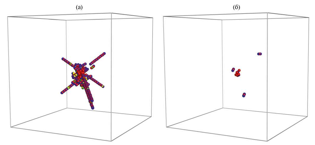 МД-моделирование каскадов смещений в неупорядоченном твердом растворе Fe–10 ат.%Cr выполнили при температуре кристалла T = 20 K. Используя теорему о вириале [74], определили равновесный параметр решетки 2.87151 Å, соответствующий нулевым внутренним напряжениям при температуре моделирования. Моделирование провели в ансамбле NVE. Моделируемый кристалл имеет форму параллелепипеда или куба с гранями {100}. Периодические граничные условия использовали на всех гранях кристалла. При малых энергиях ПВА некубическая форма моделируемого кристалла небольшого размера исключает взаимодействие цепочек последовательных замещающих столкновений вдоль направлений ⟨111⟩ со своими изображениями.