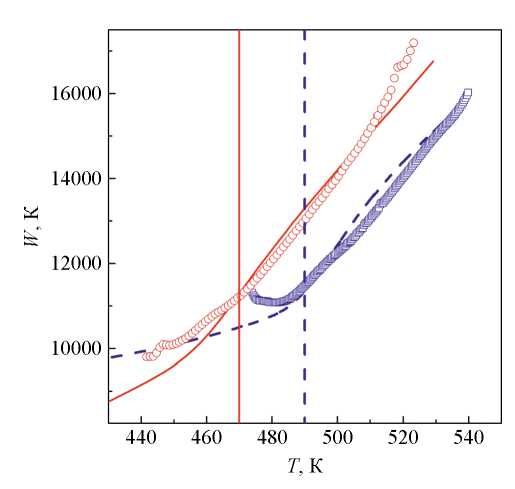 Рис. 8. Изменения работы образования критических зародышей, оцененные по соотношению (11) (символы) и рассчитанные по уравнению (7), в стеклах Al87Ni8Gd5 (○ и сплошные линии) и Al87Ni8Y5 (□ и штриховые линии) при нагреве со скоростью 0.083 K/с. Вертикальными линиями показаны температуры основных максимумов Jexp (рис. 6).