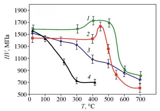 Рис. 5. Зависимости микротвердости сплавов меди, подвергнутых ДКУП, от температуры отжига (старения), выдержка 1 ч: 1 – Cu–0.21%Cr–0.20 %Zr; 2 – Cu–0.06%Zr; 3 – Cu–0.22%Cr; 4 – Cu.