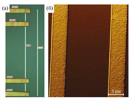 Рис. 4. (а) Фотография микрообъекта для исследования магнитной структуры; (б) изображения магнитной структуры микрополосок спинового клапана после прохождения тока (слева) и без прохождения тока (справа).