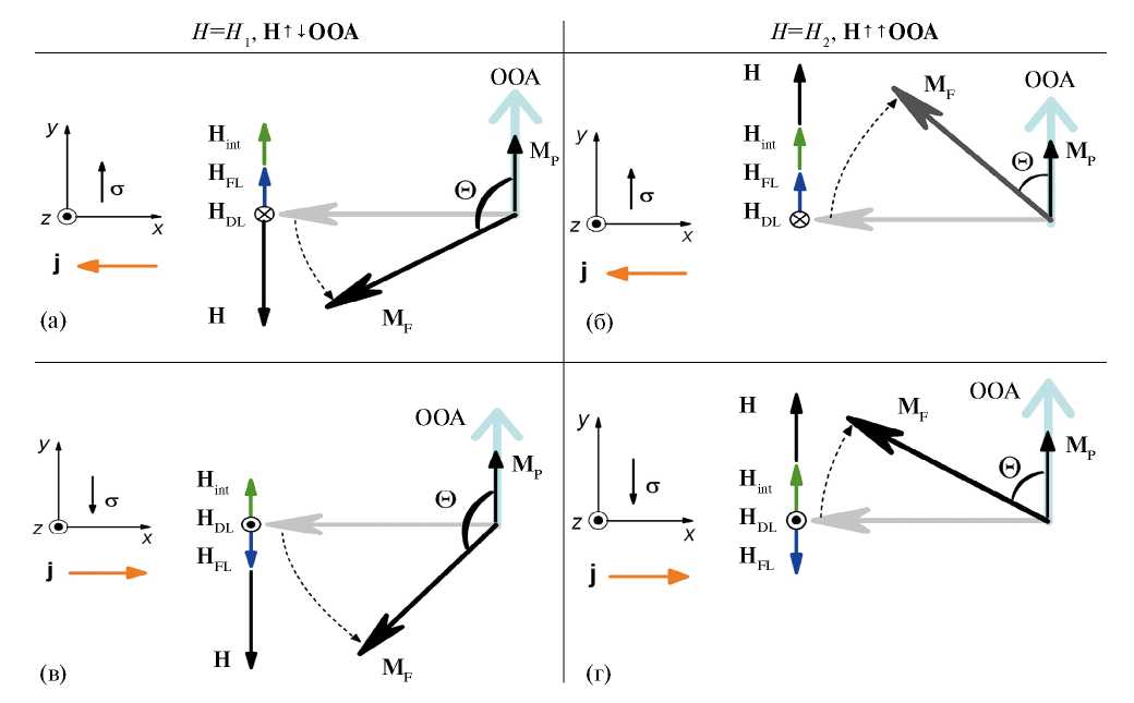 Перед пропусканием тока взаимное расположение MF и ООА близко к ортогональному. После прохождения тока происходит поворот MF и угол Θ изменяется. За исключением HDL, все действующие на MF поля лежат в плоскости пленки (xy). Поле HDL коллинеарно оси z. Из-за размерных эффектов, обусловленных малой толщиной пленки, пренебрегаем действием направленного вдоль нормали к пленке поля HDL и рассмотрим только вклад поля HFL в поворот MF. Если ток направлен против оси x (j↑↓x) (рис. 8а, б), то HFL сонаправлено с Hint, то есть действие такого поля поворачивает MF в направлении ООА и вносит вклад в уменьшение угла Θ. При изменении направления тока на противоположное (j↑↑x) (рис. 8в, г), поле HFL противонаправлено с Hint и, соответственно, отклоняет MF от ООА и способствует увеличению угла Θ. Эти представления полностью согласуются с результатами экспериментов.
