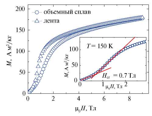 Аналогичная картина наблюдается для сплава GdTbDyHoEr в быстрозакаленном состоянии. На рис. 4 в качестве примера приведены кривые намагничивания M(H) для некоторых наиболее характерных температур. При этом в области температур метамагнитного перехода ГАФМ–ФМ воздействие внешнего магнитного поля в случае быстрозакаленной ленты оказывается более эффективным (рис. 5). На вставке рис. 5 показан способ определения величины критического поля Hcr, при которой начинает разрушаться магнитная структура ГАФМ, как точка пересечения двух прямых, являющихся экстраполяциями двух участков кривой намагничивания. При T = 150 K величина Hcr составила 0.7 Тл и 0.5 Тл для сплава GdTbDyHoEr в объемном и быстрозакаленном состояниях соответственно. Изменение магнитной части энтропии SM было определено по данным измерений магнитных изотерм на основе соотношения Максвелла: