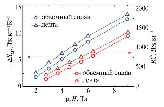 Эффективность рабочего тела магнитного холодильника определяется не только величиной DSM max, но и так называемой хладоемкостью, RC, показывающей количество теплоты, передаваемое при охлаждении 1 кг материала за один термодинамический цикл при определенном изменении магнитного поля [1, 17]. Величина RC рассчитывается в процессе интегрирования как площадь под кривой –ΔSM(T). При этом пределами интегрирования служат температуры на половине высоты пика: