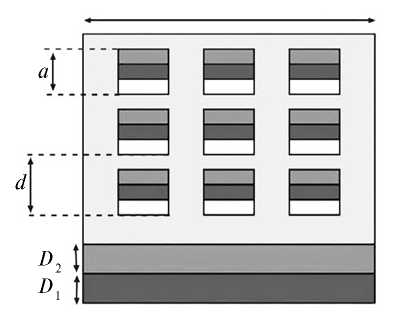 Решетка антиточек реализована в виде пор, размещенных в узлах квадратной сетки с периодом d. Поры имеют квадратное сечение со стороной a. Внутри пор отсутствуют атомы, а, следовательно, спины имеют нулевое значение. В компьютерном эксперименте размеры пор оставались неизменными, а период решетки антиточек варьировали. Такой подход приводит к изменению общего количества спинов системы, что существенно сказывается на свойствах системы. Варьировали также толщину магнитомягкой пленки D2.