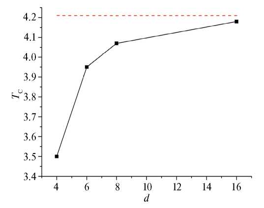 Расчеты показали, что общая температура фазового перехода в бислойной пленке не зависит от толщины магнитомягкого слоя и практически совпадает с температурой Кюри магнитотвердого слоя. Эта закономерность наблюдается как для сплошной пленки, так и пленки с решеткой антиточек при любом периоде d. При этом температура Кюри зависит от периода решетки антиточек (рис. 3).
