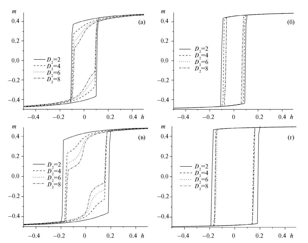 Рис. 6. Петли гистерезиса для пленок с различной толщиной магнитомягкого слоя D2, отношением обменных интегралов R и периодом решетки антиточек d: (a) R=0.4, a=2, d=4; (б) R=0.4, a=2, d=8; (в) R=0.8, a=2, d=16; (г) R=0.8, a=2, d=16.